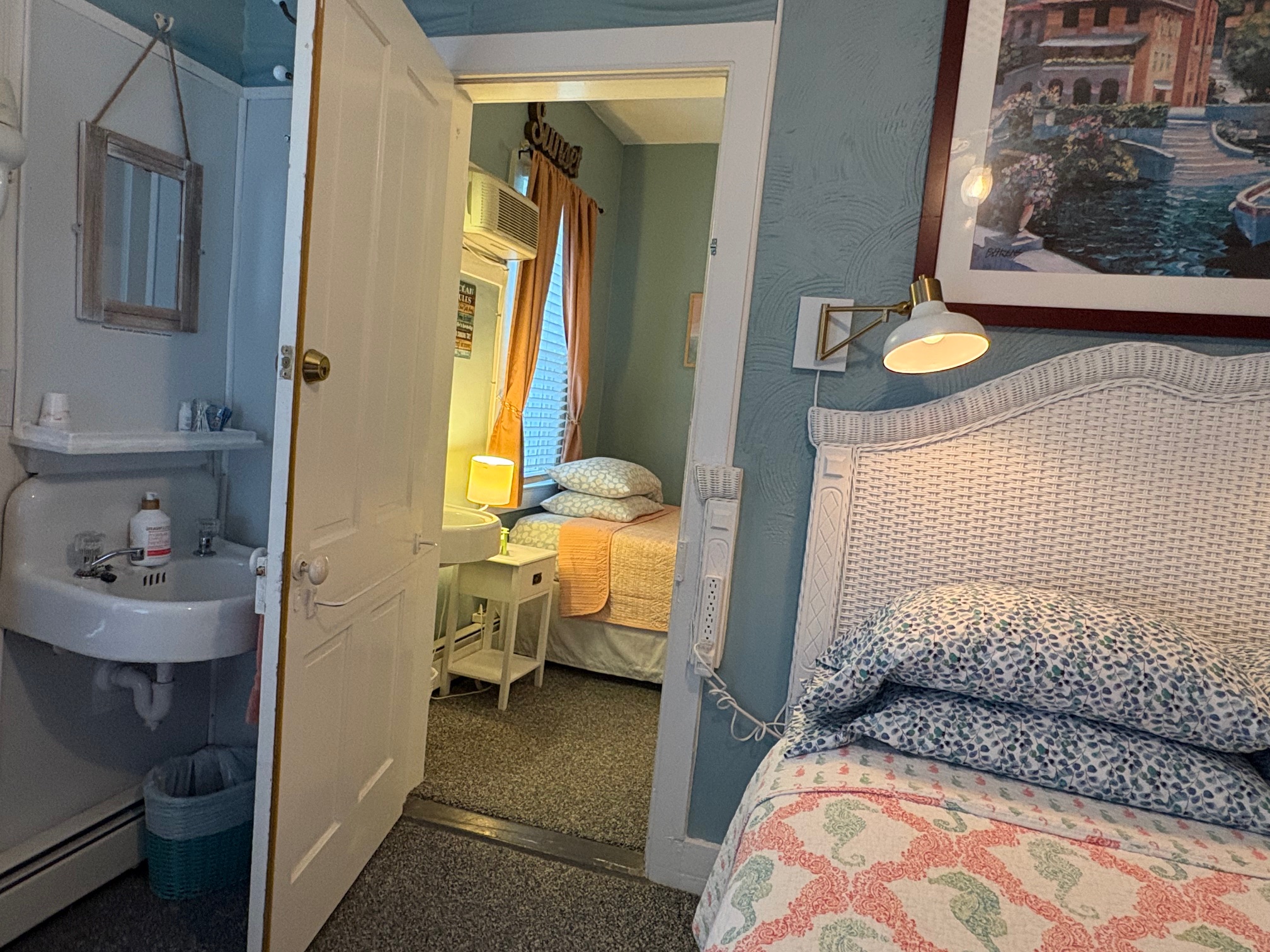The Coral Gables Suite sleeps up to 4 adults. This suite is ideal for parents with children or friends traveling together. The primary room has a queen bed with dresser, sink, and flat-screen smart TV. Connected to that room is a second room that has a full-size bed with its own dresser and sink. A private full bathroom with walk-in shower is just steps down the hall. The sleeping rooms also include ceiling fans, spa robes, hair dryers, and bath amenities.